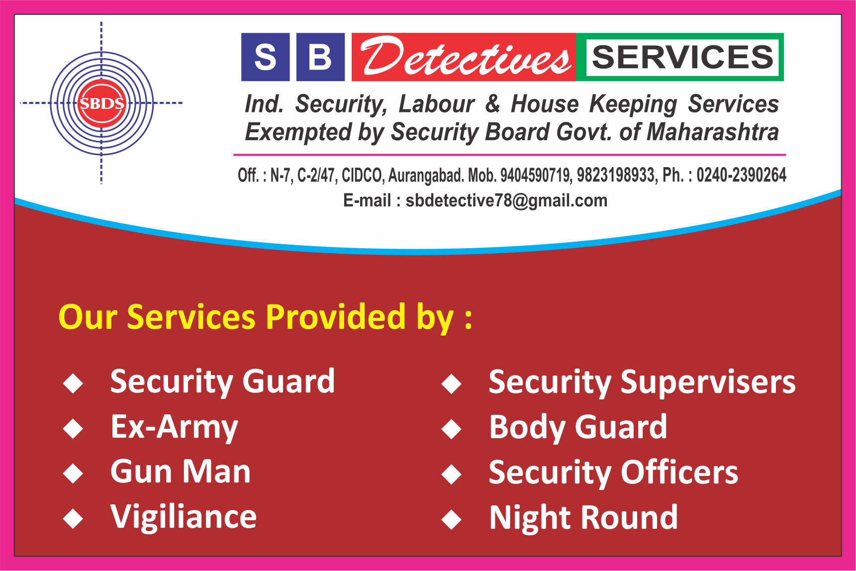 We S B Detective Services are professional manpower recruitment agency i.e. Security guards, Skilled labour, Unskilled labour, and housekeeping services, that serving 20 years in industries and multinational corporate, ports, banks, educational institutes, Residential and staff townships.